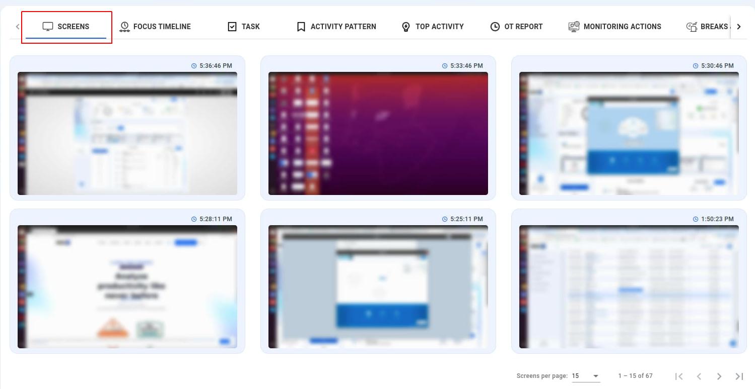 Screenshots: View screenshots captured during employee work sessions to monitor their screen activity.