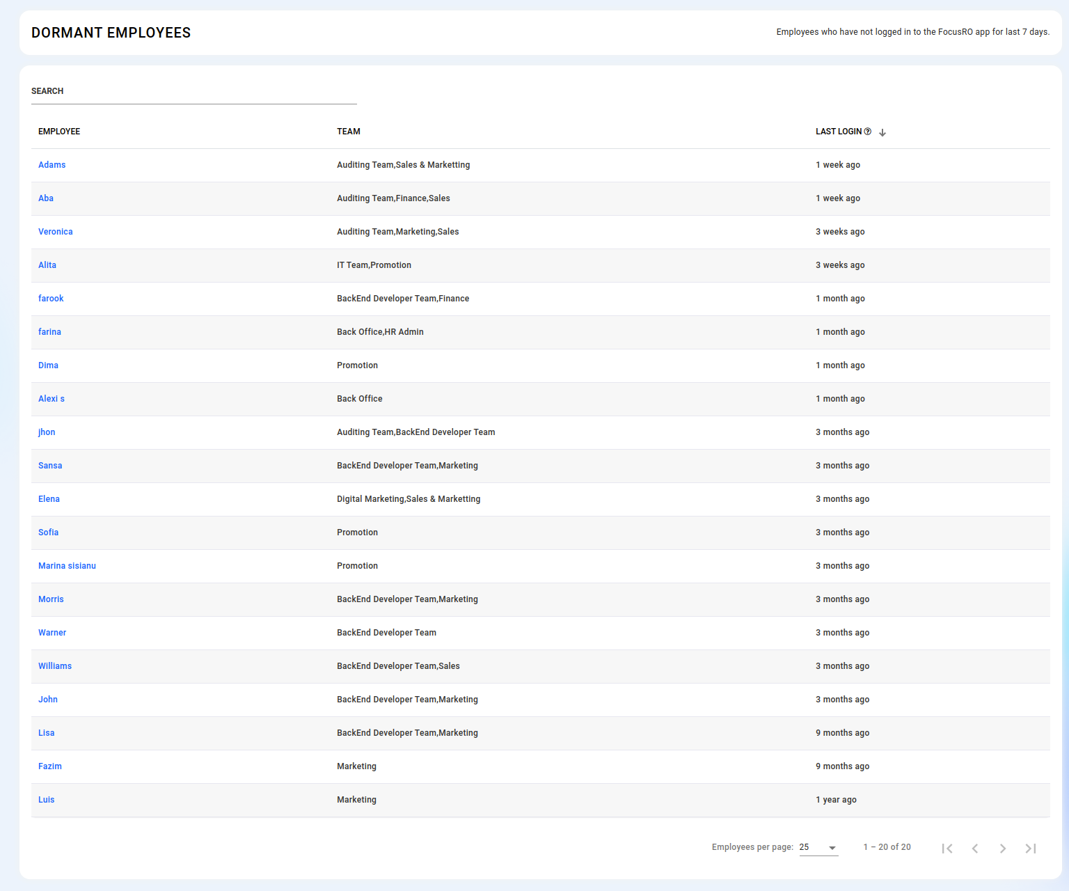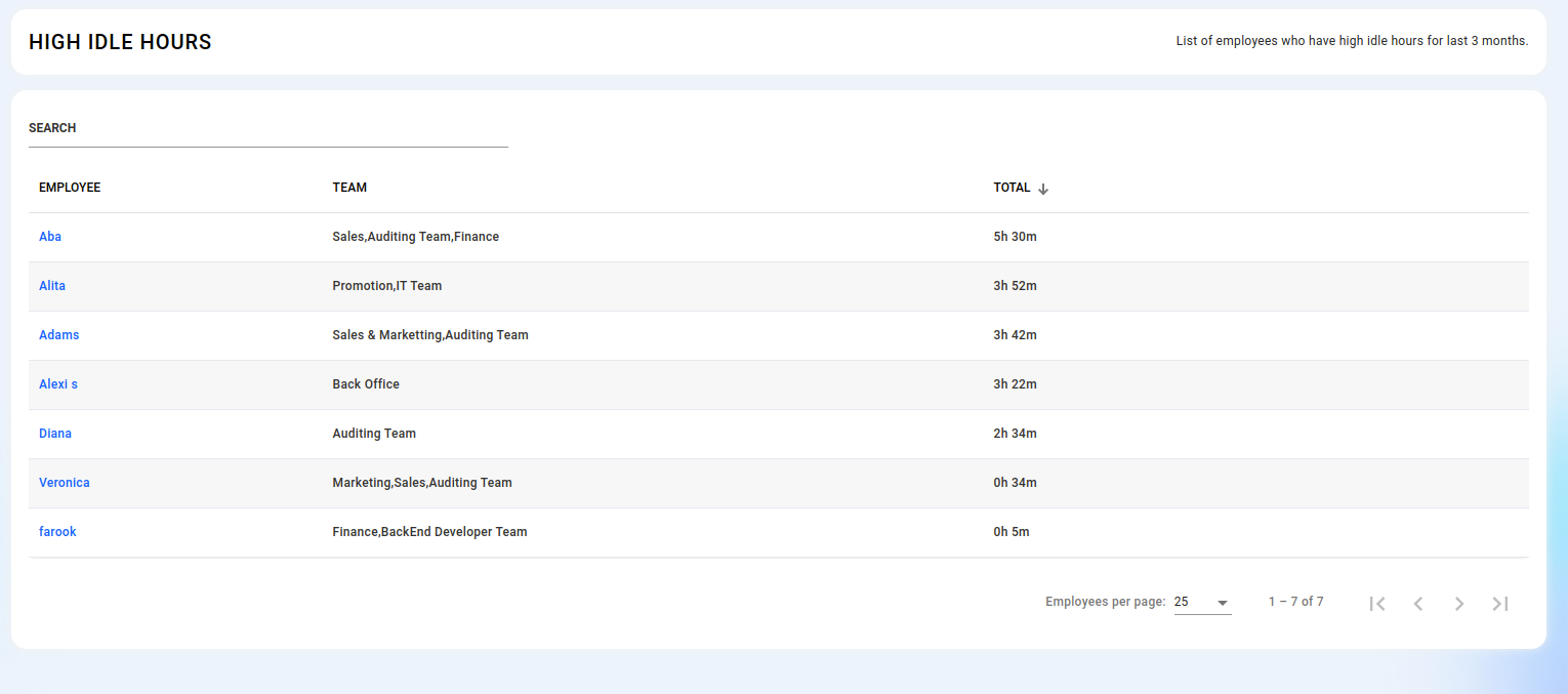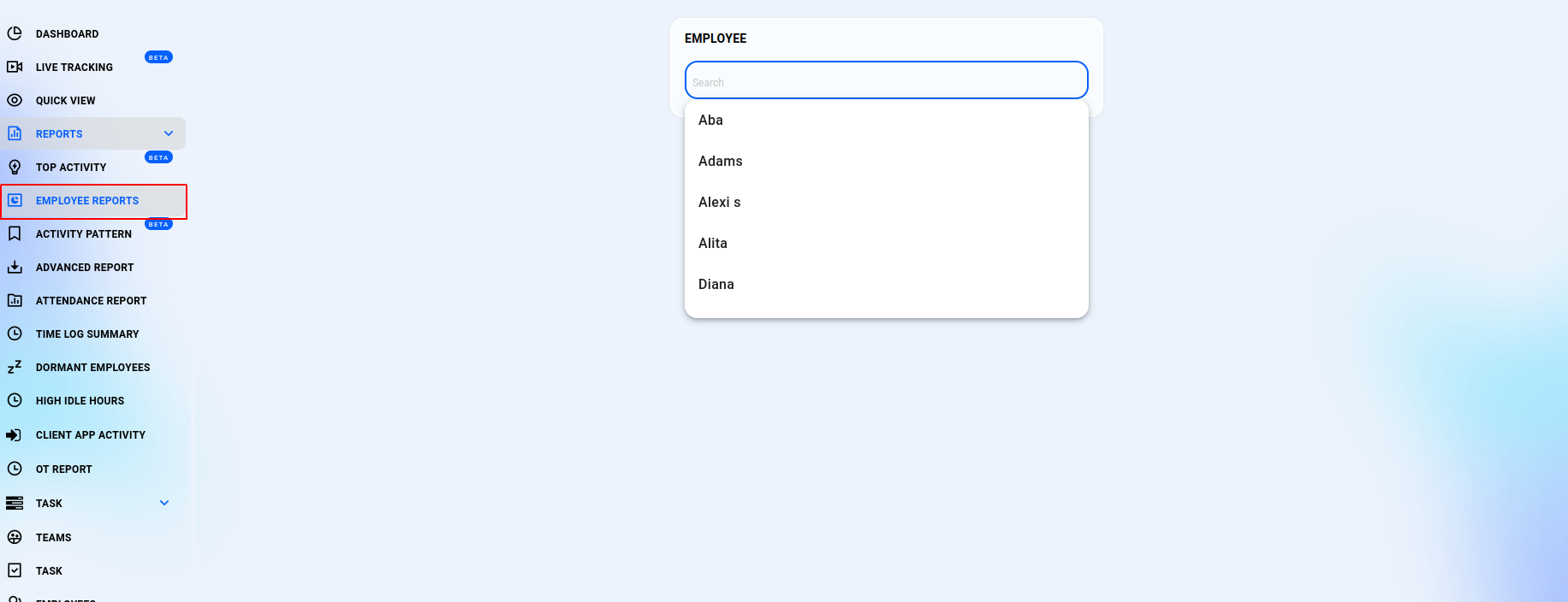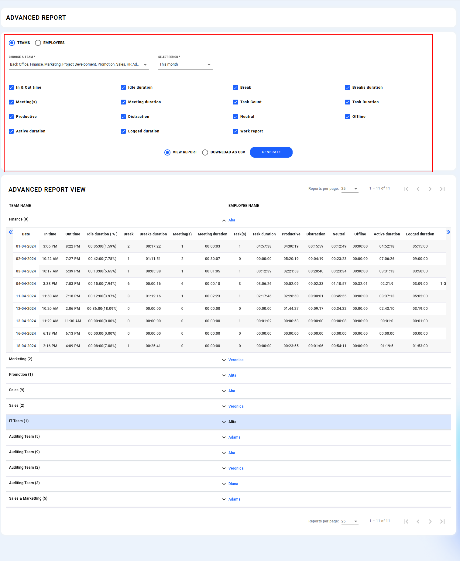 Examine comprehensive reports for both teams and individual employees by selecting either "Teams" or "Employees" from the menu.
