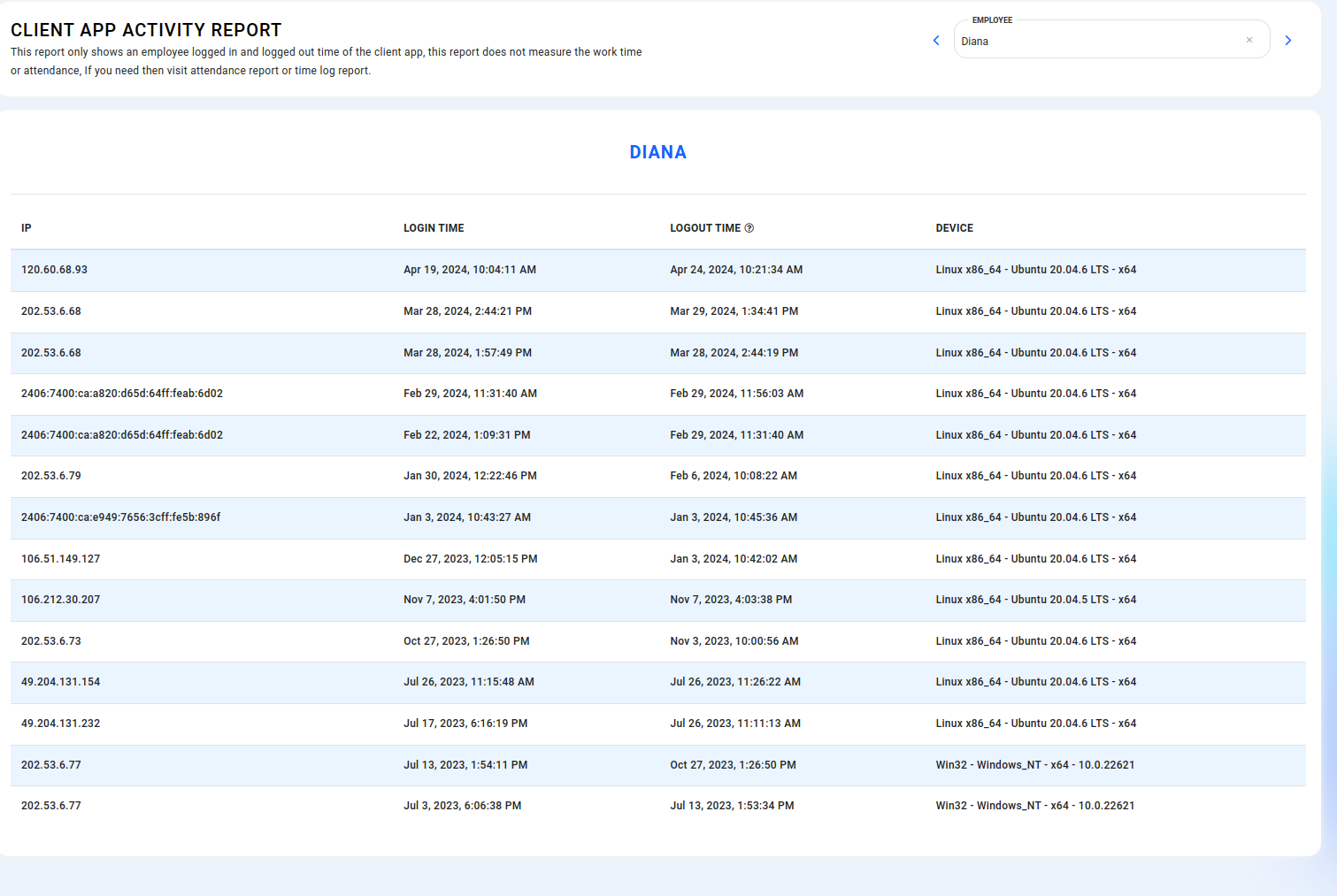 This report exclusively presents the login and logout times of employees using the client app. It does not track work hours or attendance; rather, it focuses on measuring their IP address and device information.