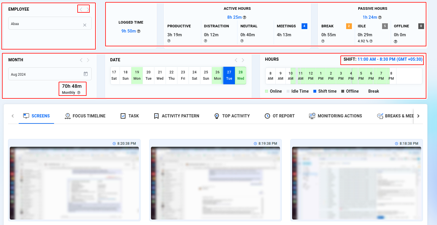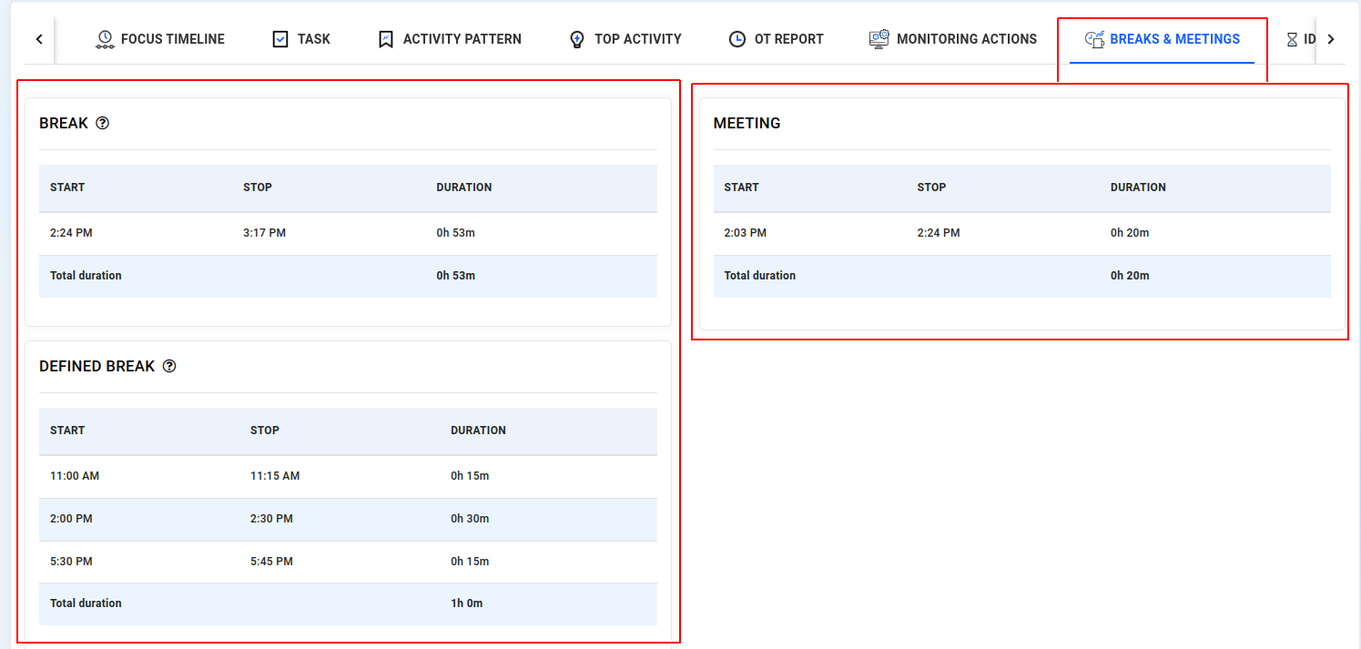Time Metrics: Track how much time employees spend on productive tasks, distractions, and neutral activities. This includes monitoring hours spent on breaks, meetings, idle time, and offline periods.