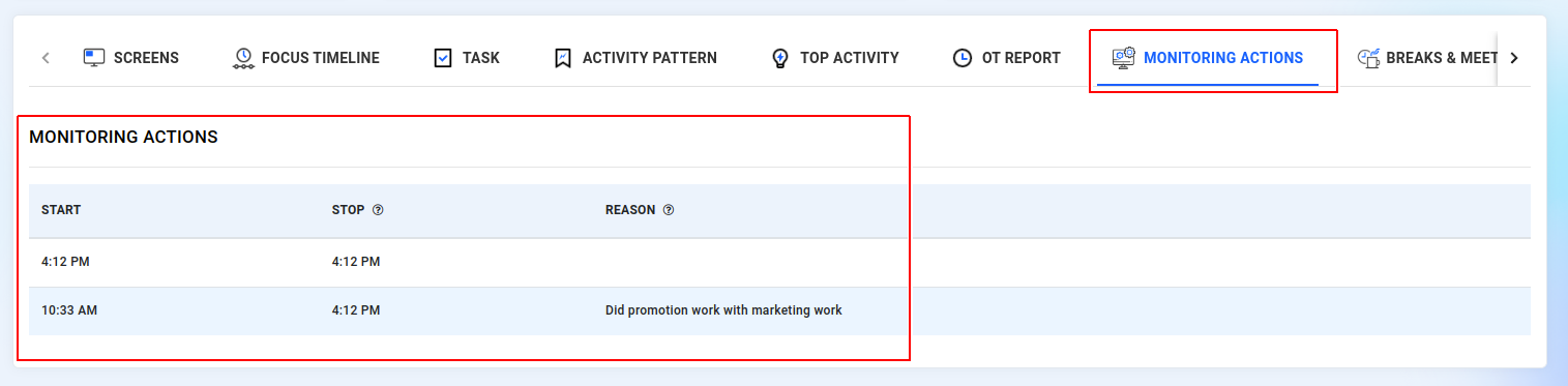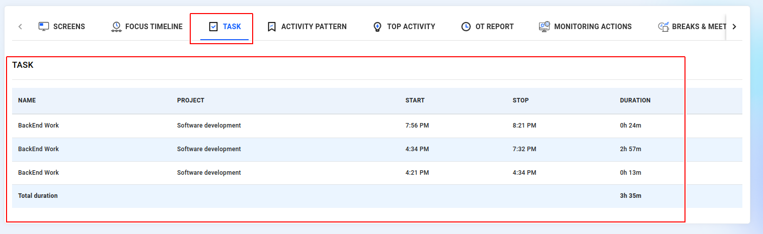 You can track the duration of time employees dedicate to tasks, including their start and stop times, as well as the number of tasks they engage in throughout the day.
