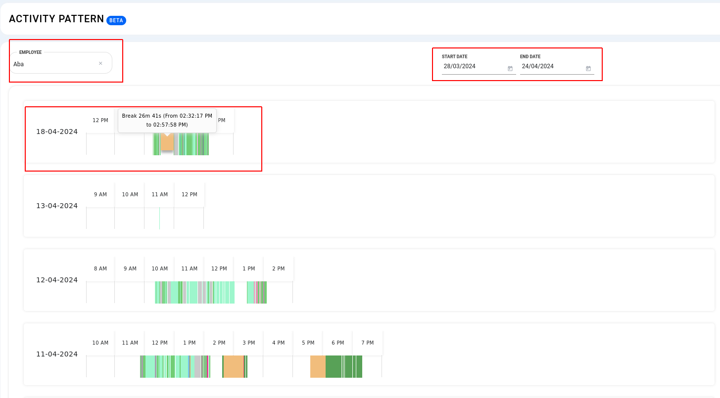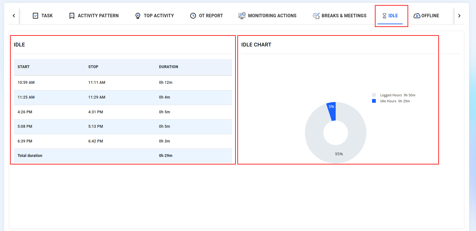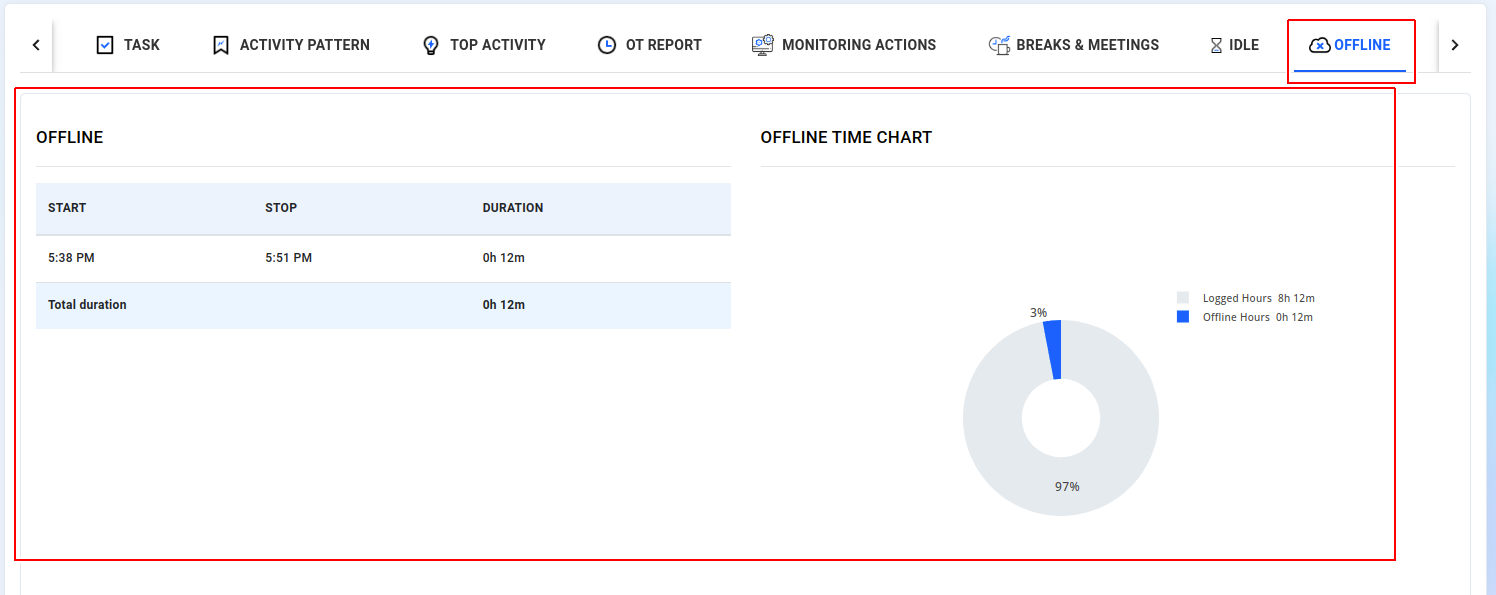 As a administrators and managers can now view your employees' offline records, including start and stop times, along with a graphical representation. Offline duration includes instances such as when the system enters sleep or suspend mode, which are calculated as periods of offline activity.