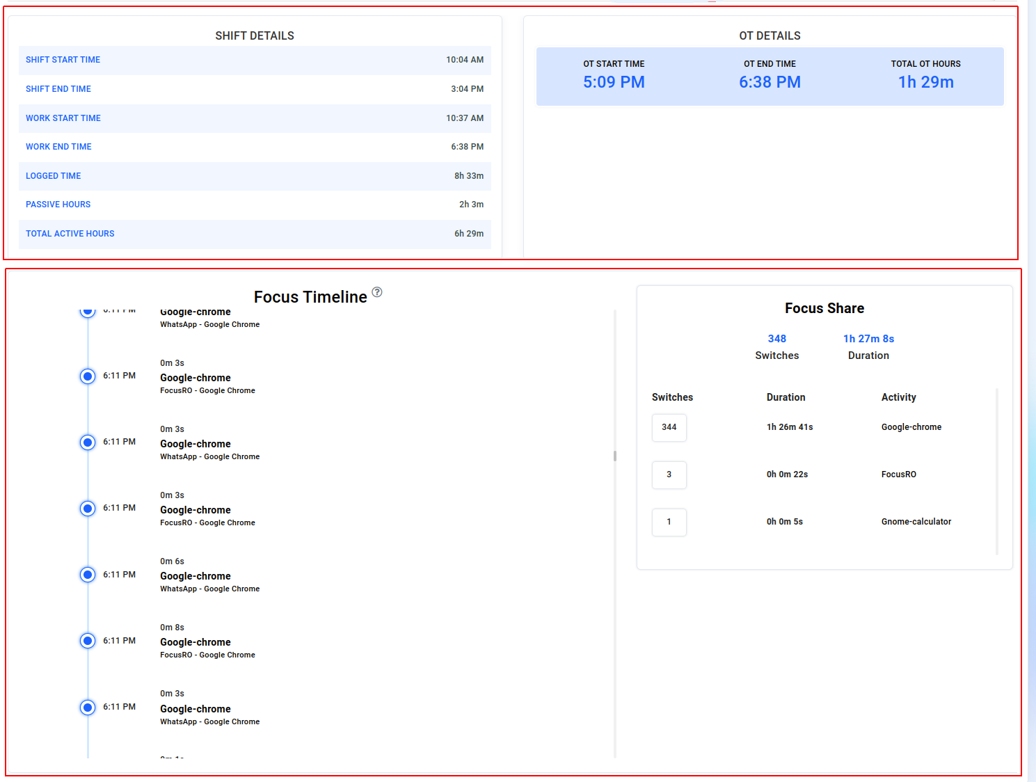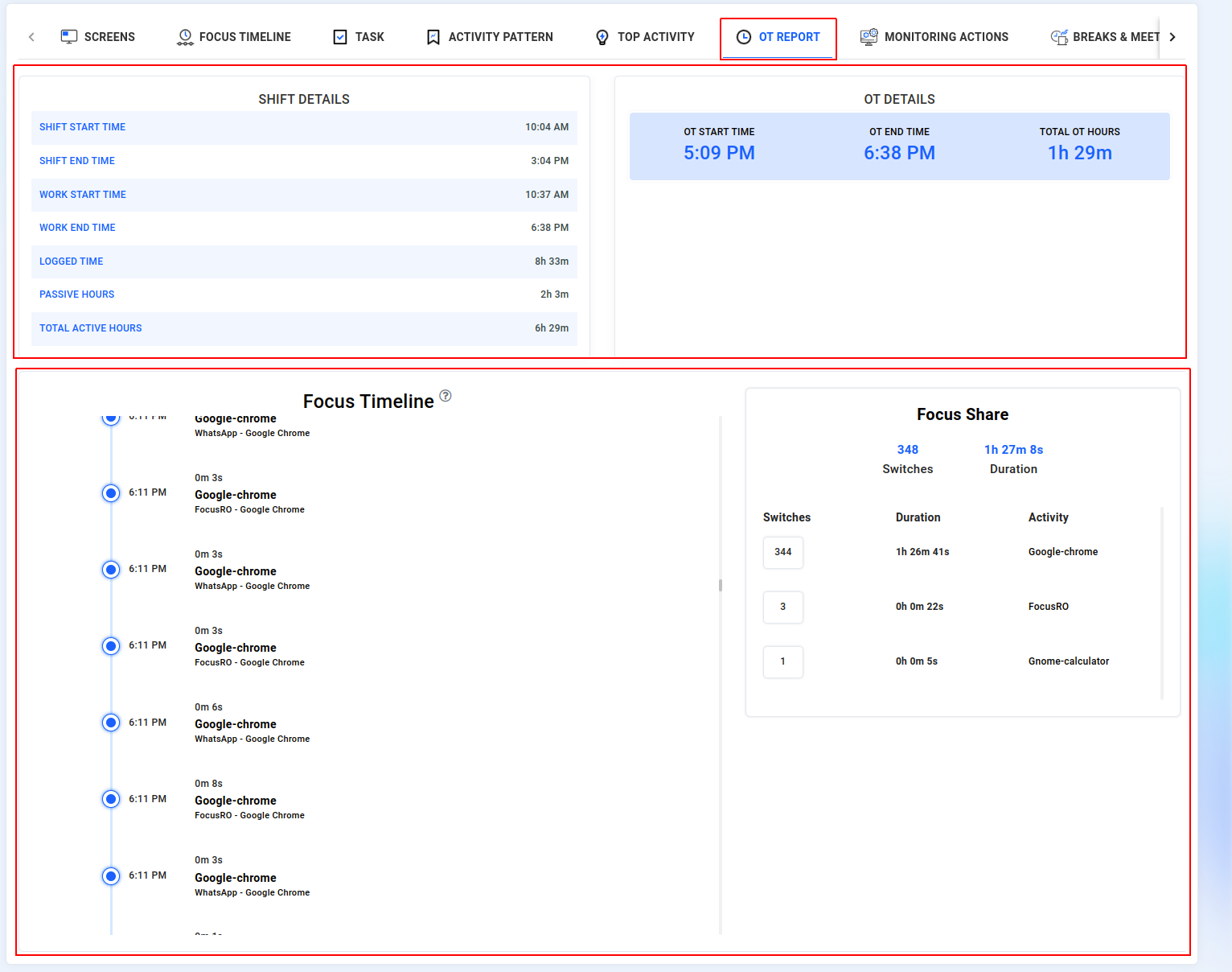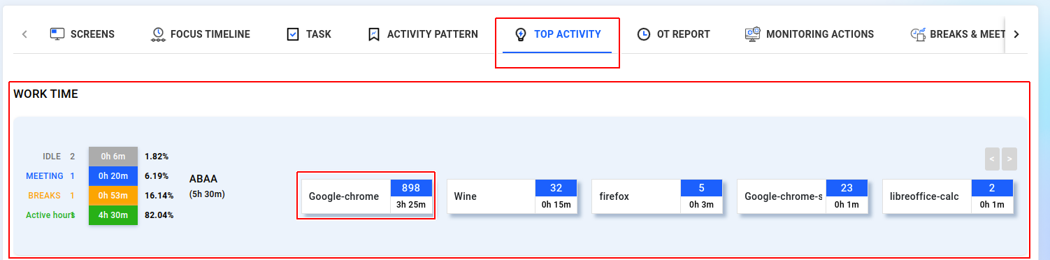 You can monitor your employees' activities over time, including detailed insights into software usage and overtime duration. These reports provide a thorough view of the additional time employees are working beyond their regular hours, allowing you to effectively track their performance and manage their workload.