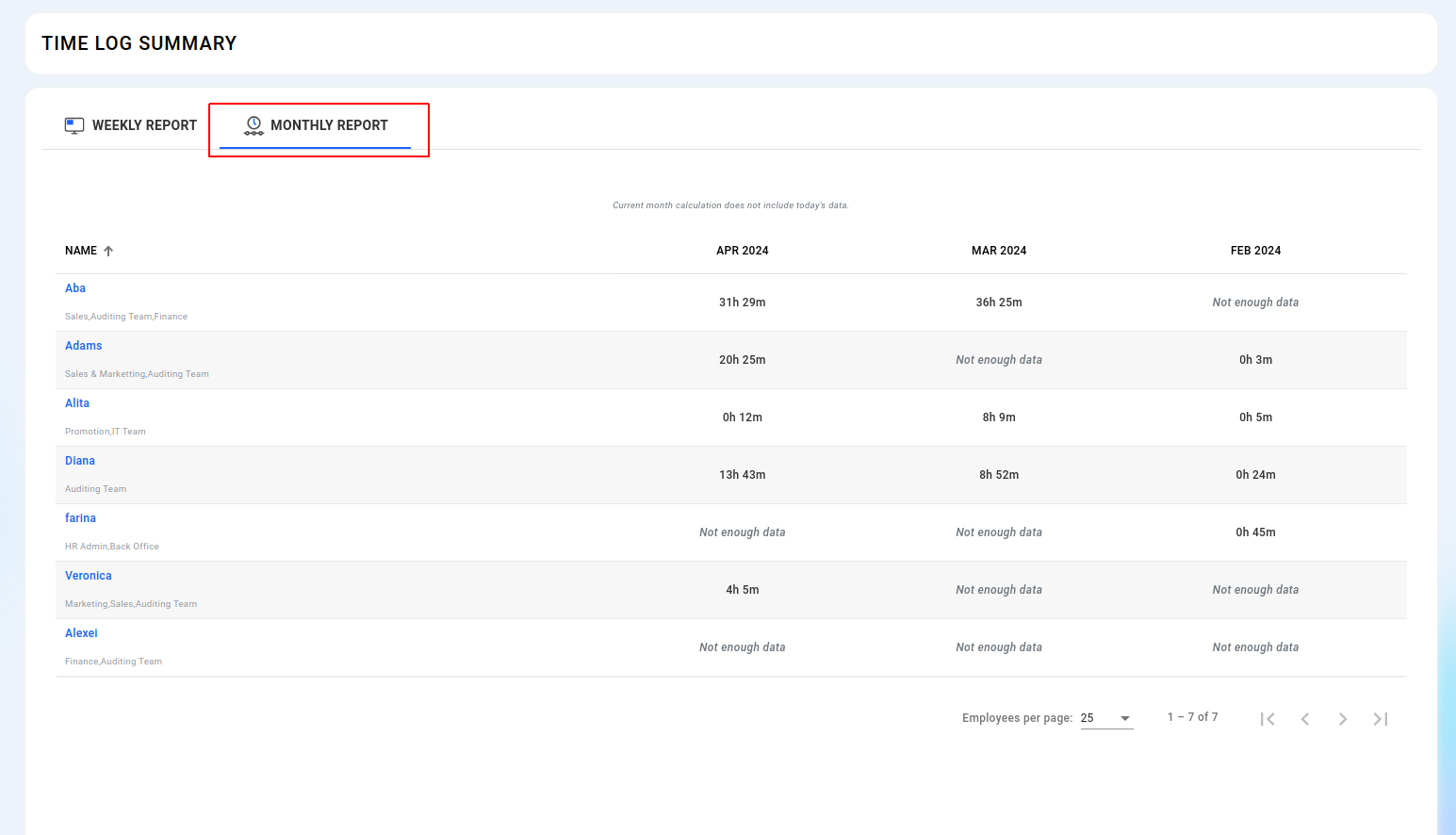 Select "Monthly Report" to view the total working hours for employees on a monthly basis, covering the current month and the previous two months.