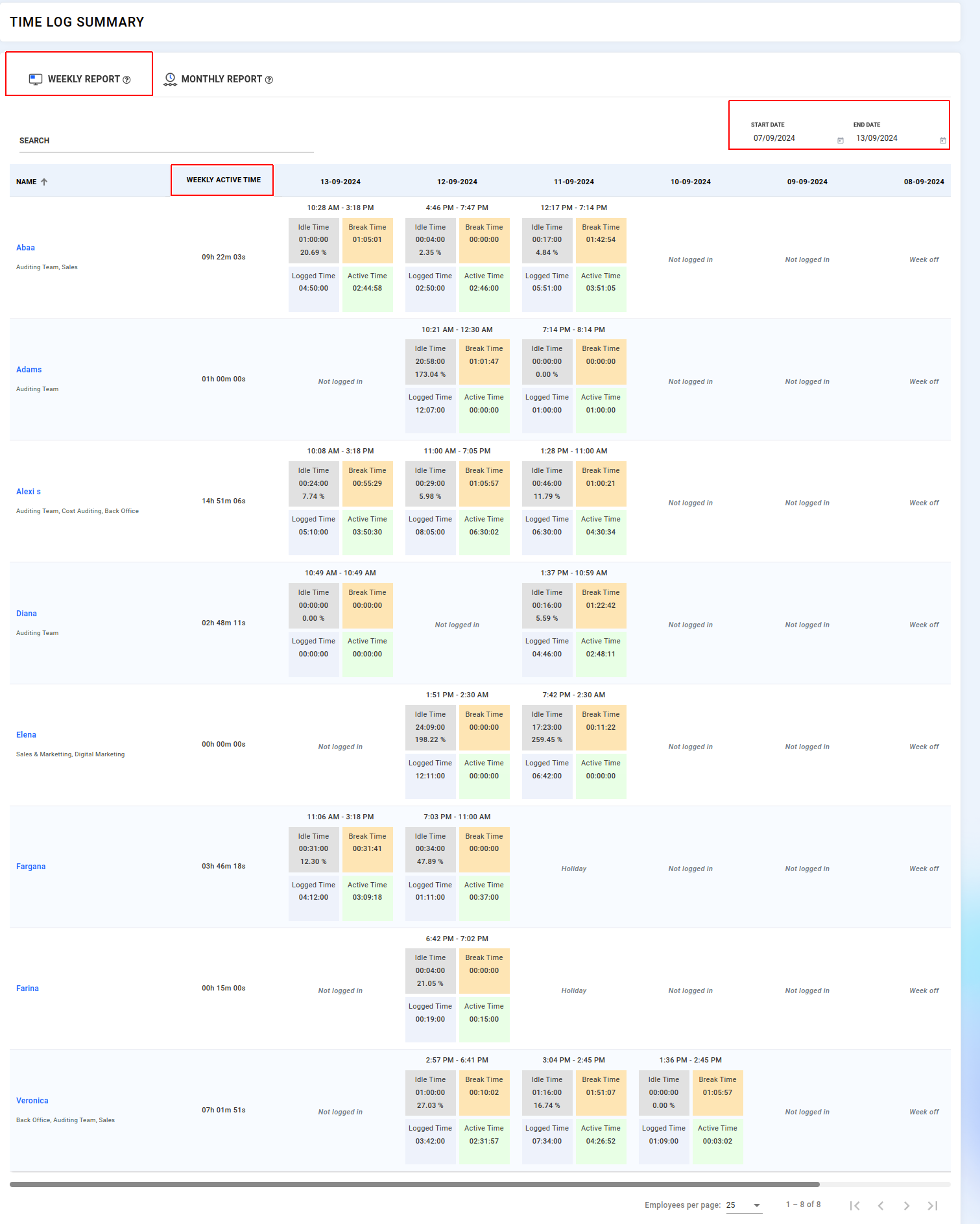 On the “Weekly report,” you can view the employees' work start and stop times, along with their active and idle times.
